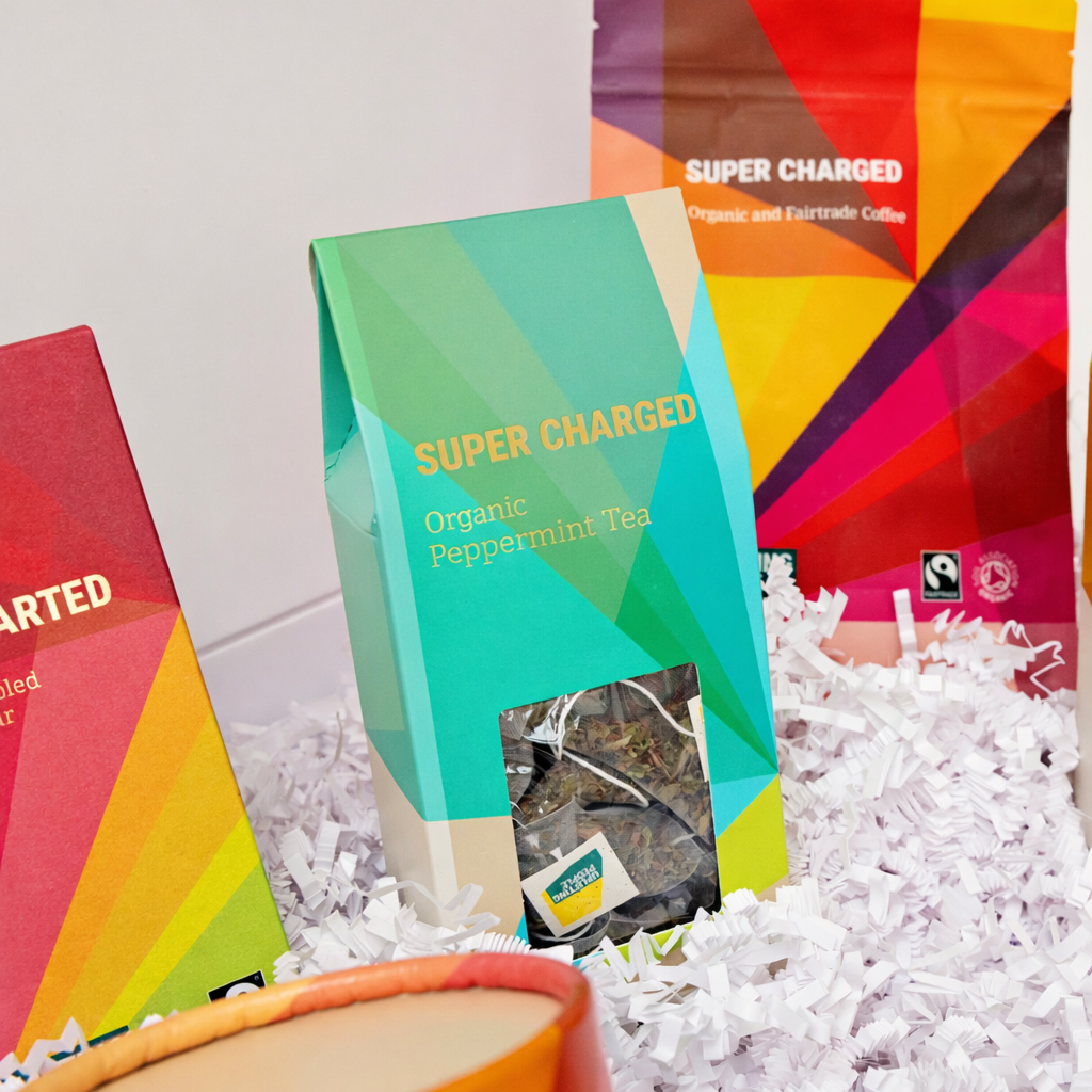 This gift set includes one Kind Hearted organic chocolate bar (choose from milk, marbled, or dark chocolate orange), a tub of Kind Hearted organic vanilla fudge, a box of Super Charged organic tea, a stylish 3 cup Bodum French Press and a bag of organic & Fairtrade Super Charged coffee.